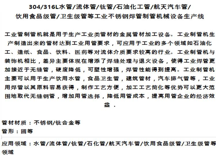 不銹鋼管焊管機就是用于生產工業類管材的金屬管材加工設備。不銹鋼管焊管機生產制造出來的管材達到工