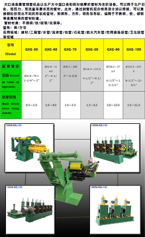大口徑不銹鋼管制管機是以生產大中型口徑和相對較厚的管材為主的設備。可以用于生產石化、高壓力、高流量等要求高的管材。此外,通過制管機配合模具設計加以焊接,可以直接輕松擠壓出不同的形狀成管材,如圓形,方形,矩形等形狀,適用于不銹鋼、鐵、碳鋼等金屬材質的管材制造。